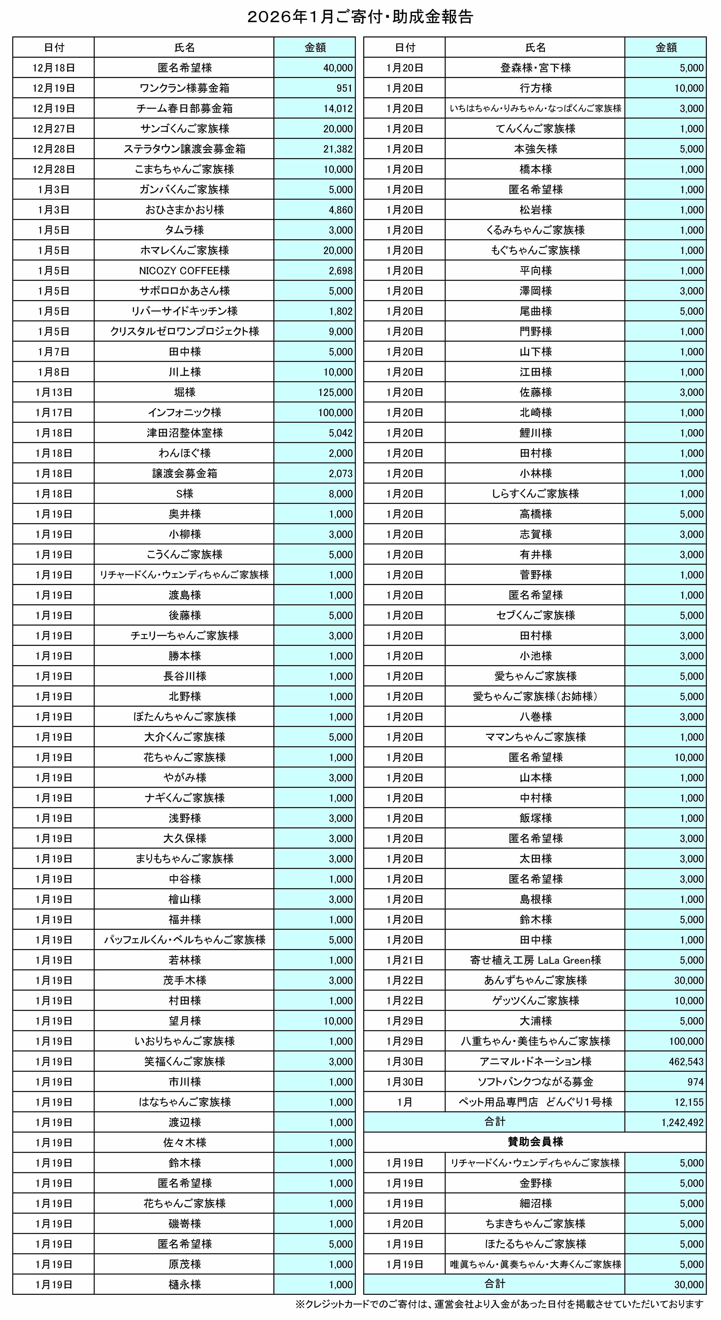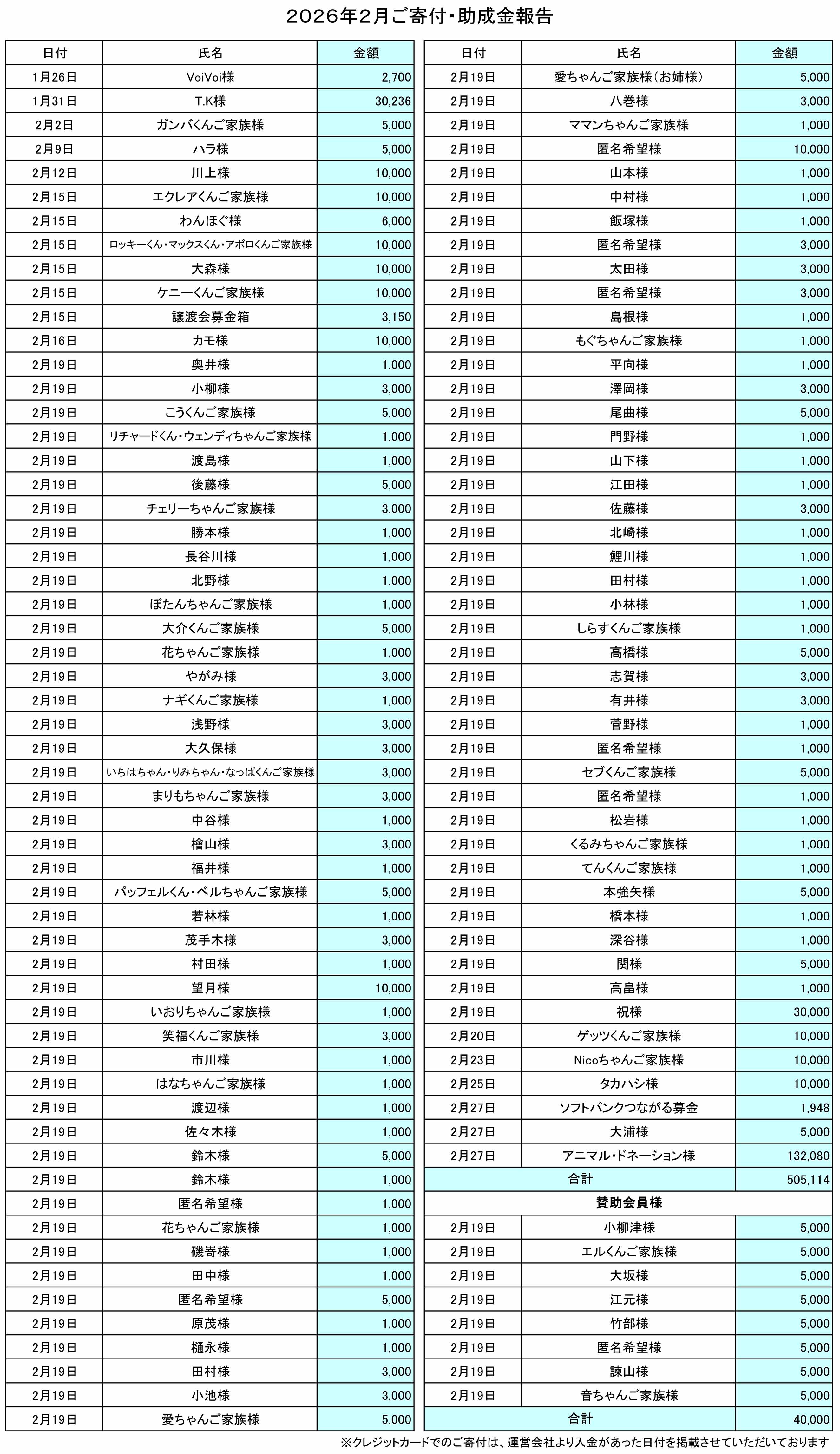 | 寄付金 | 里親様 ご負担金 | フリマ売上 Tシャツ | 仮払金返金 | その他 | 収入合計 | 医療費 | トリミング | 仕入品 | 仮払金 | 譲渡会場費その他 | 支出合計 | |||